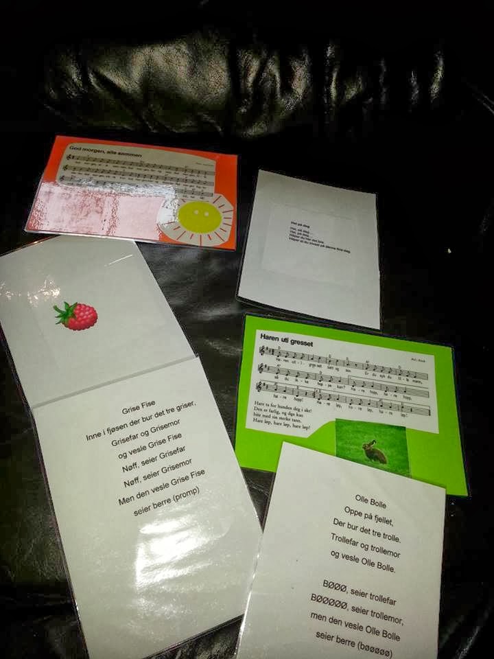 Deretter er det litt forskjellig. Me pleier å synge «Røysekatt», «Vesle (og andre) Petter Edderkopp», «Tre små griser», lese litt anten i ei bok eller nokre lesekort som eg har, om følelsar.